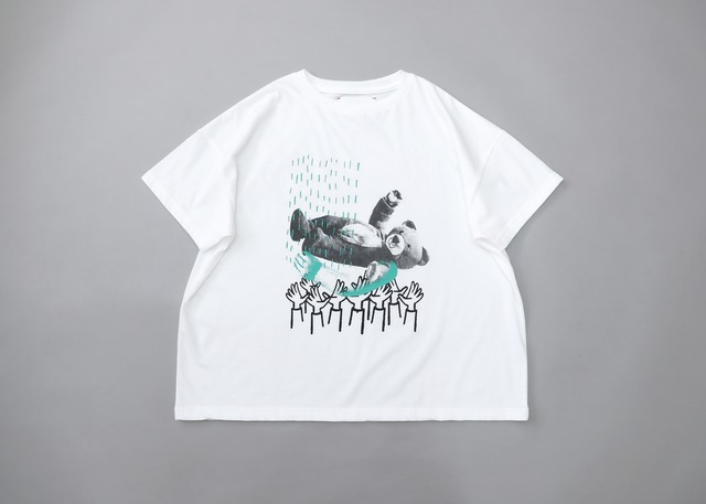 michirico【michirico Bear T(X, XL, XXLサイズ)】 michiricoのメインビジュアル でもあるBear。 着ぐるみ胴上げのコラージュ。 ミントグリーンの差し色を 効かせたデザインです。 当店入荷カラーは ホワイトとクリーム 2026S/S collection 「MY FAVORITE DAY」 特別な日じゃないけど花を飾ったり 好きなことに時間を使い過ごしたり お気に入りの洋服を着て出かけたり ふつうの日のわたしの好きな日 素材: material: cotton100% Made in Japan モデル: 126cm/XL, 133cm/XL(グレージュ/ホワイト) 120cm/L(クリーム) 166cm/F 平置き実寸: 身幅/裄丈/着丈 michiricoは、フォトグラファーのmasacova!がディレクションを務めるデイリーウェアとフォトプロダクトのブランドです。 長年写真を通したものづくりに携わってきた彼女が作り出す、ちょっぴりシュールでユーモアのあるmichiricoのアイテムたち。 こどもの頃の記憶を辿るようなテーマを軸に流行に左右されない、クラシカルでベーシックなシルエットは、長年Tシャツを軸にデザインに関わってきたこだわりがたっぷり詰まっています。 旅先で撮影した写真や、日々のくらしから得たインスピレーションを毎日着れる、使える、愛すべきものたちへとカタチにしてゆく。 日常の中に物語を見つけるような、そんな思い馳せれるものづくりを心がけています。