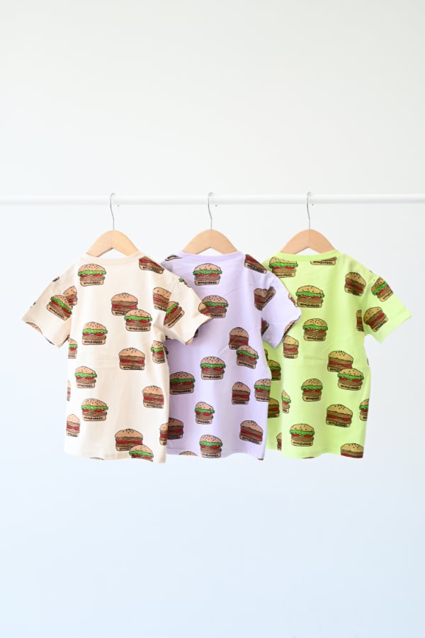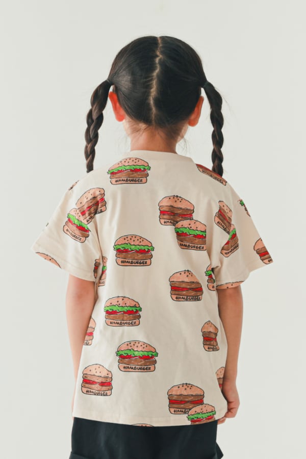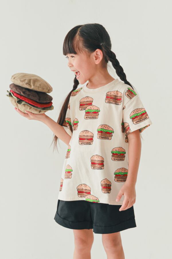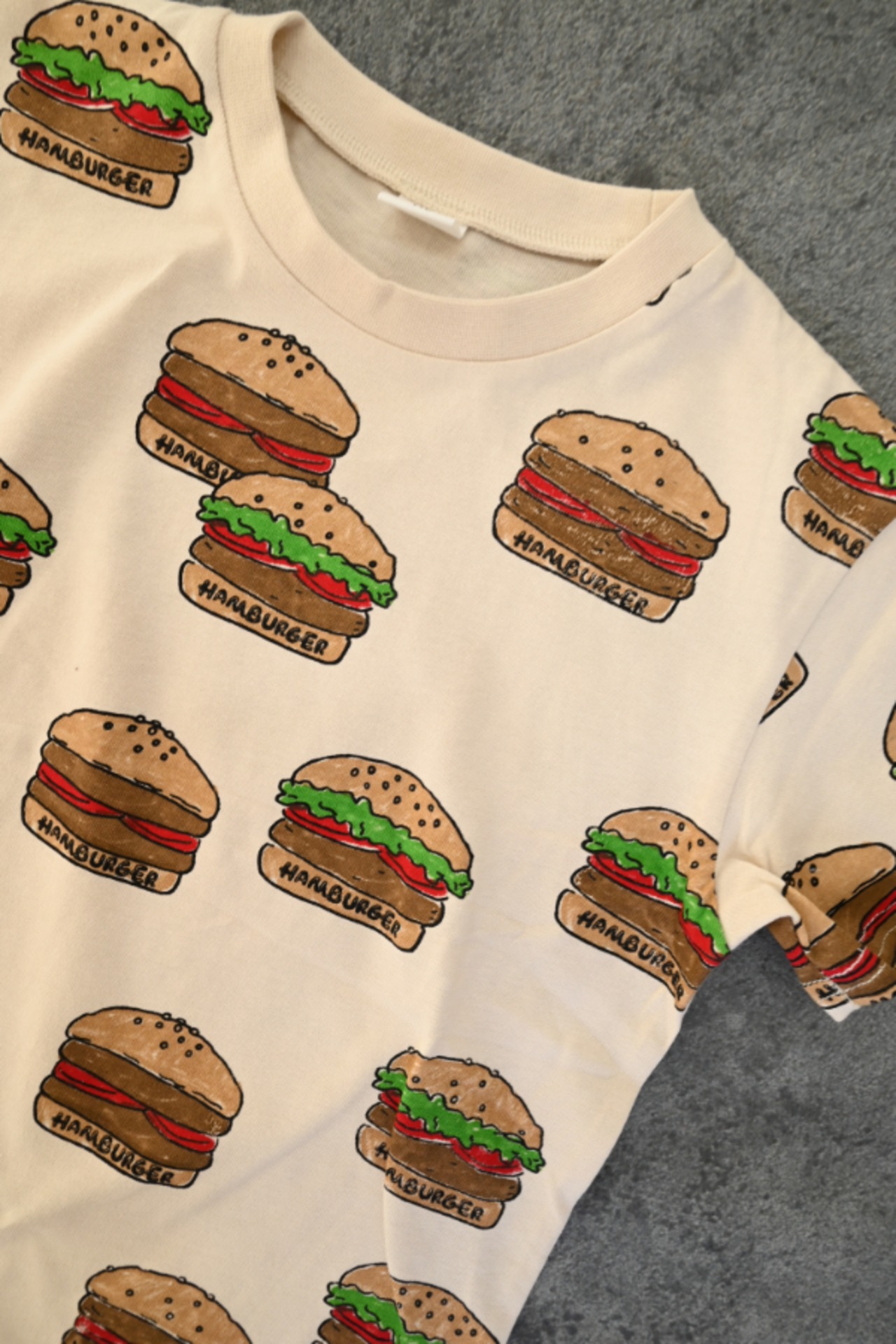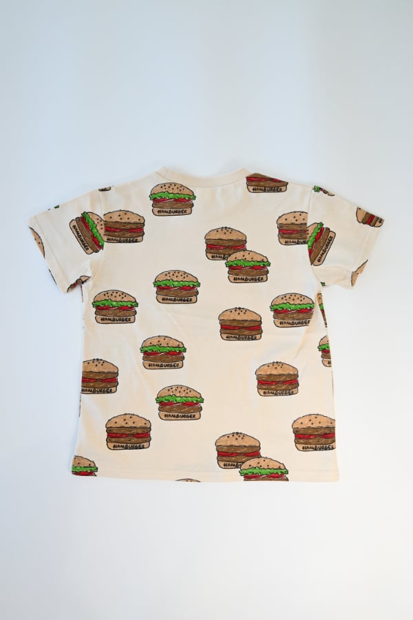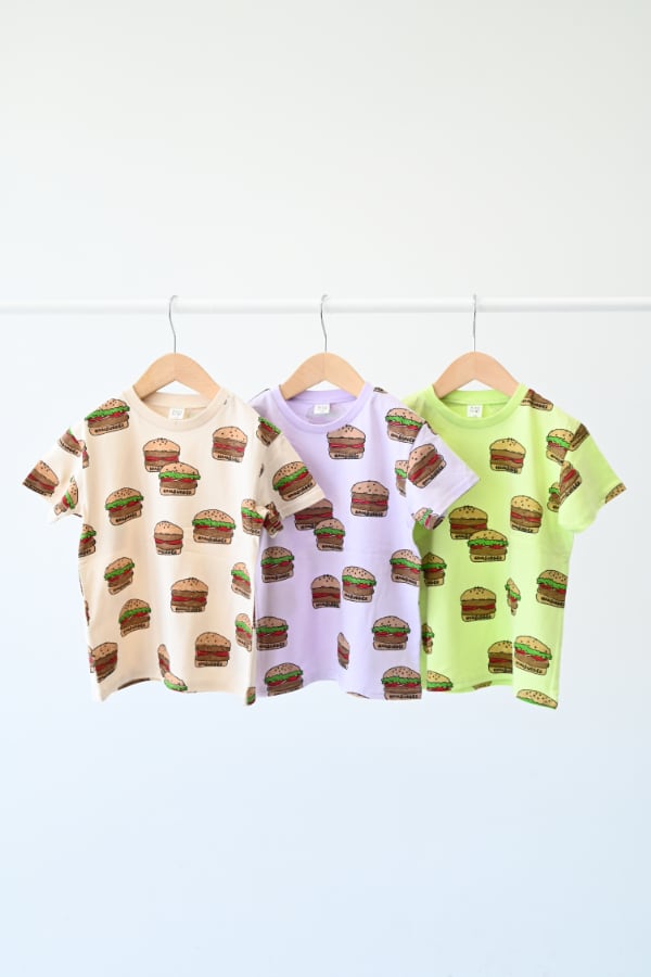手描きなので硬くなりすぎず味のあるハンバーガープリントです。