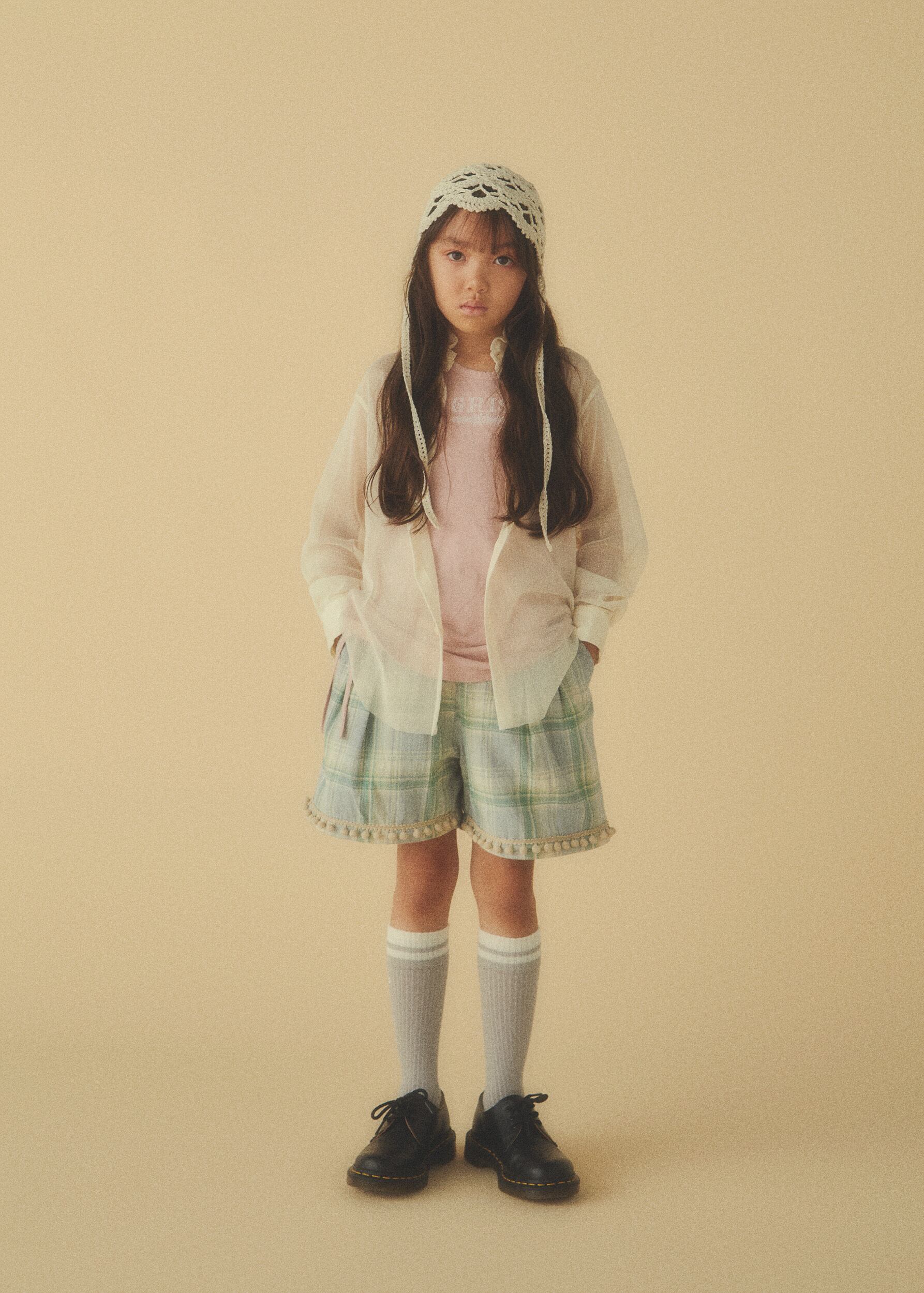 また、切り替え位置のフロント部分にもシャツと同様飾りのボンボンテープを叩き付けております。